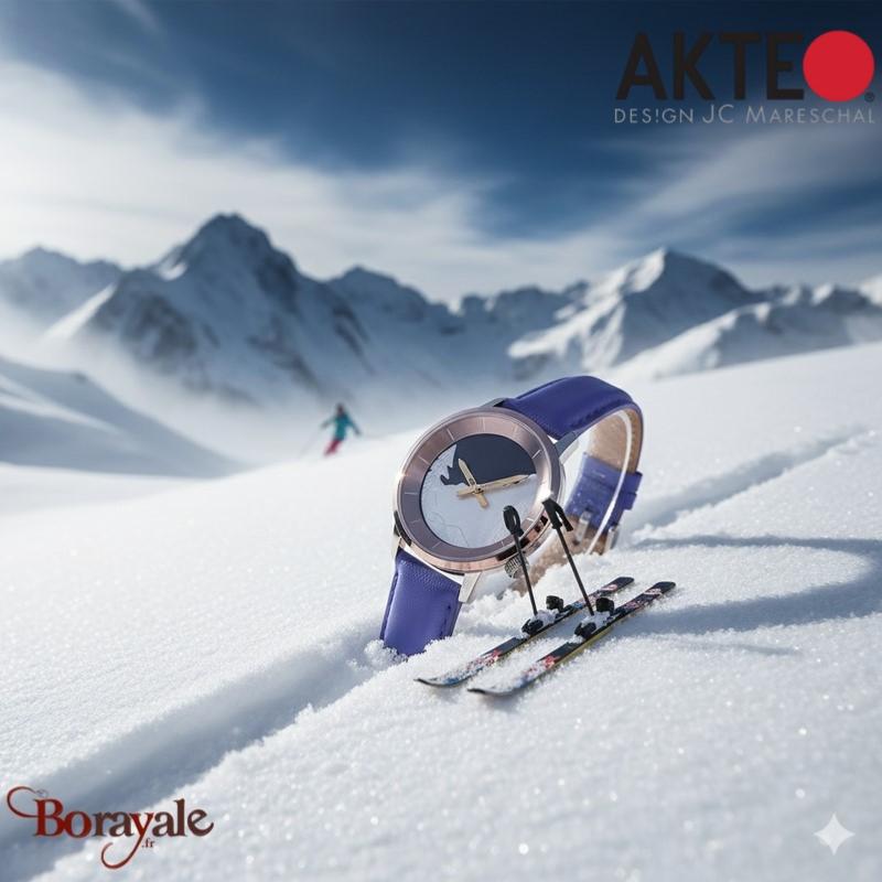 La Montre AKTEO Ski (Référence SMo07) est une pièce ingénieuse issue de la collection française Sport, dédiée à l'univers des sports d'hiver et de la glisse. Elle est conçue pour les passionnés de montagne et de neige, transformant le temps en une célébration de la saison de ski.