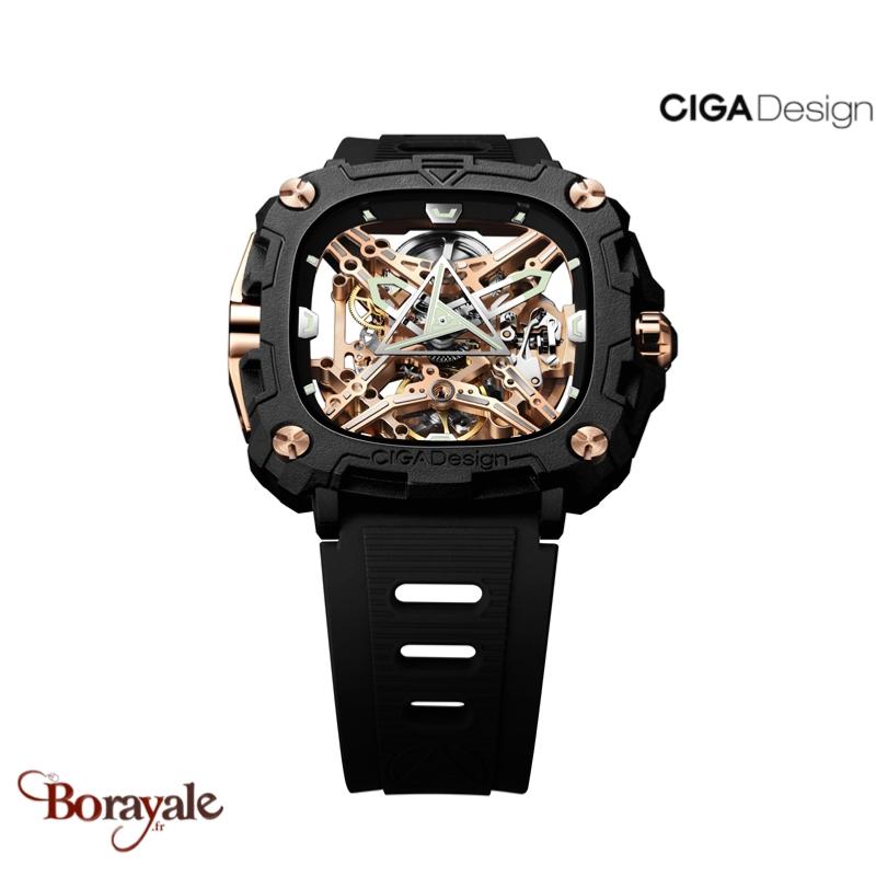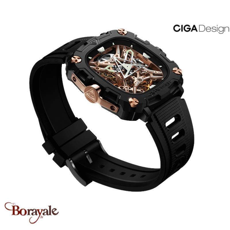 Mecanisme : La montre est équipée d'un mouvement automatique (à remontage automatique) CD-01, développé en interne par Ciga Design. Ce calibre bat à une fréquence de 21 600 alternances par heure (3 Hz) et offre une réserve de marche d'environ 40 heures. Le fond transparent permet d'admirer le mouvement, ce qui est un atout pour les amateurs de mécanique.