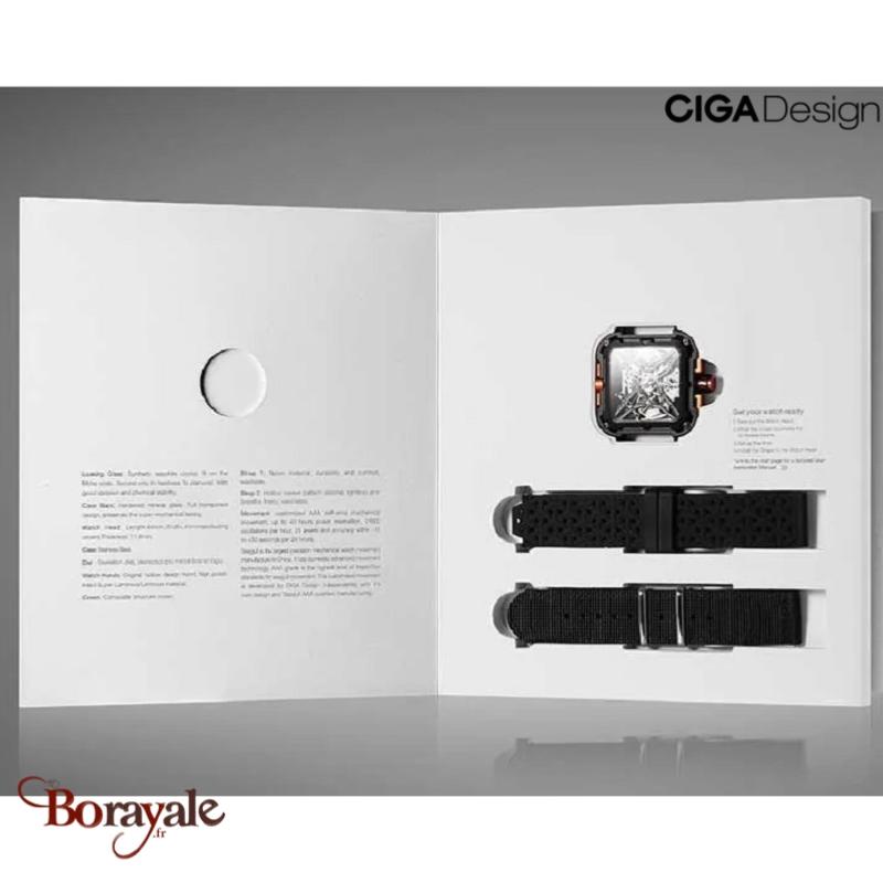 Mecanisme : La montre est animée par un mouvement automatique (à remontage automatique) CD-01, développé en interne par Ciga Design. Ce calibre, visible à travers le fond transparent, offre une réserve de marche d'environ 40 heures.