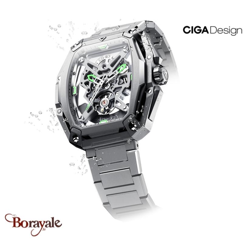 Mecanisme : La montre est animée par le calibre automatique CD-07, un mouvement interne (in-house) développé par Ciga Design. Il bat à une fréquence de 28 800 (4 Hz) et dispose d'une réserve de marche d'environ 40 heures. Le rotor, visible à travers le fond transparent, est en forme de "ancre", ce qui ajoute une touche de design supplémentaire.
