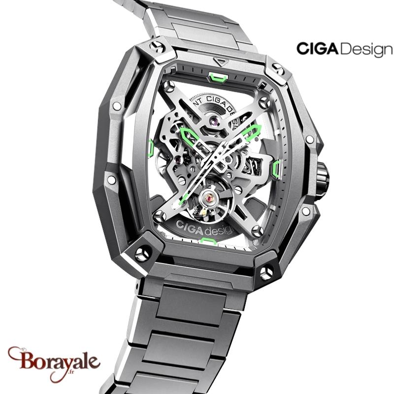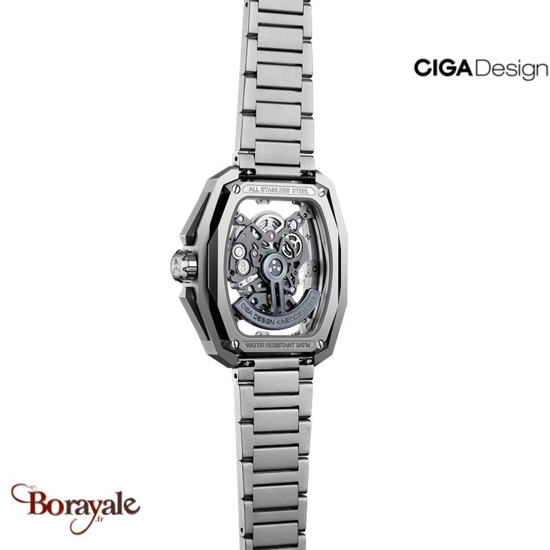 Le cadran est entièrement squeletté, offrant une vue dégagée sur le mouvement mécanique. Ciga Design a poussé le concept en augmentant la visibilité de 200% par rapport à des montres squelettes classiques. Les ponts et la platine du mouvement sont ajourés, brossés et polis pour mettre en valeur le travail d'horlogerie. Cette transparence permet d'observer chaque détail du mécanisme en mouvement.