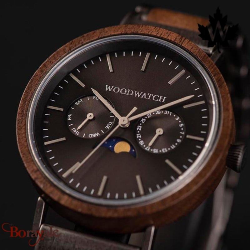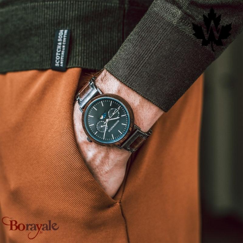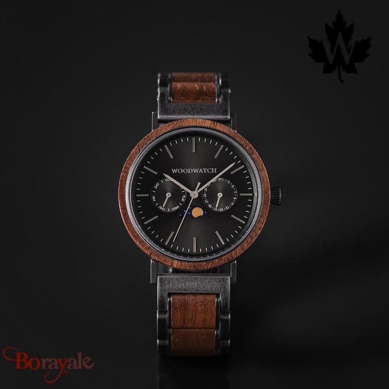 2. #Histoire du modèle#La collection ELEMENT est composée de quatre modèles uniques de la gamme WoodWatch, présentant une combinaison d'acier inoxydable 316 et de bois. La montre Brushed Iron Walnut de 41mm de diamètre présente notre mouvement caractéristique en phase de lune et deux sous-cadrans pour afficher les jours de la semaine et les mois. Le cadran en métal noir, assorti au bracelet brossé, est fini à la main avec des détails en bois de noyer et en argent de qualité supérieure. Facilement interchangeable avec nos bracelets en cuir.